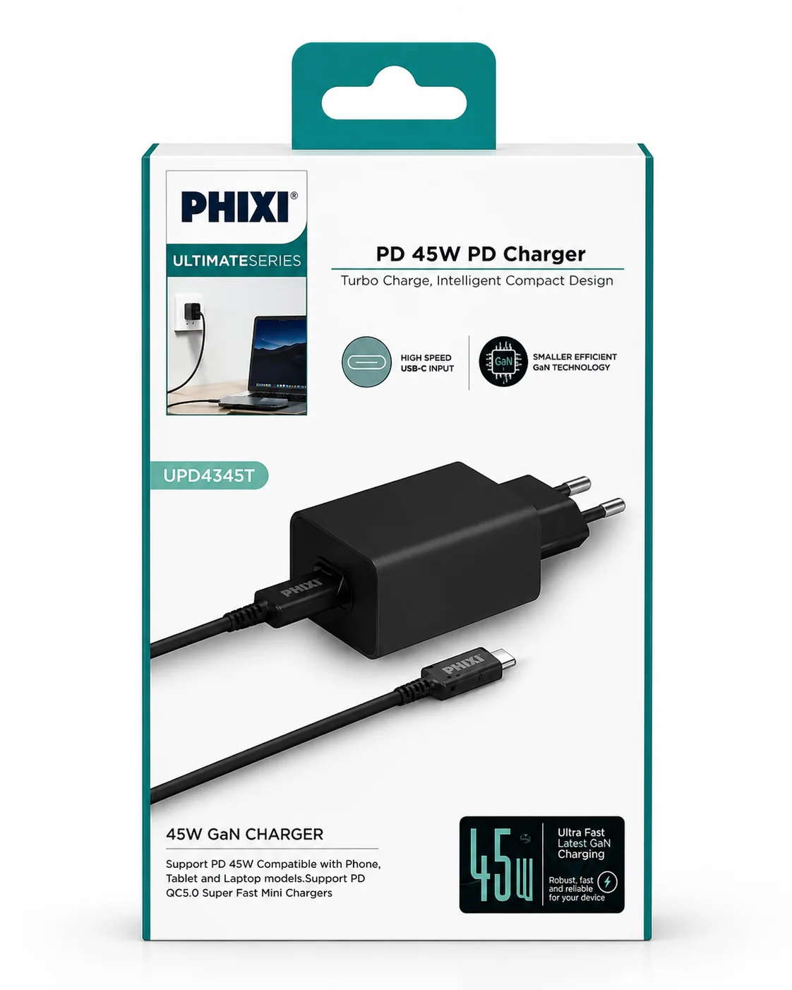 Telefon, tablet ve uyumlu dizüstü bilgisayarlar için geliştirilen 45W hızlı şarj adaptörü. GaN teknolojisi sayesinde daha kompakt yapı sunar, yüksek verimlilikle güvenli ve hızlı şarj sağlar. Günlük kullanım ve seyahat için idealdir.