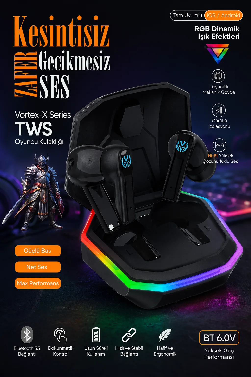 Vortex-X TWS oyuncu kulaklığı ile rakiplerinin bir adım önüne geç! Vortex-X Phantom RGB TWS, oyuncular ve güçlü ses deneyimi arayan kullanıcılar için tasarlanmış yeni nesil kablosuz kulaklıktır. Gecikmesiz bağlantı, güçlü bas performansı, dinamik RGB ışık efektleri ve ergonomik yapısıyla oyun oynarken, müzik dinlerken ve günlük kullanımda üst düzey deneyim sunar.